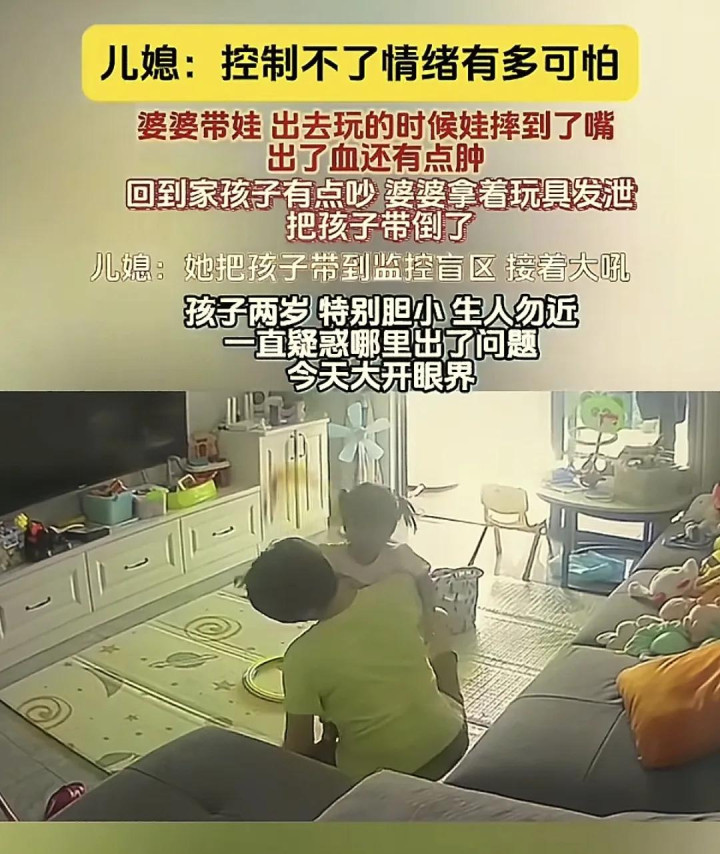一个妈妈在视频里面就看到奶奶带着孩子出去玩的时候,孩子不小心摔到了嘴出了血还有点肿,回到家的时候孩子因为嘴巴疼就有点吵闹,奶奶就拿着玩具不断的发泄,用力地捶打玩具,孩子在旁边都吓到了,一下子还不小心碰到孩子,孩子摔倒了。