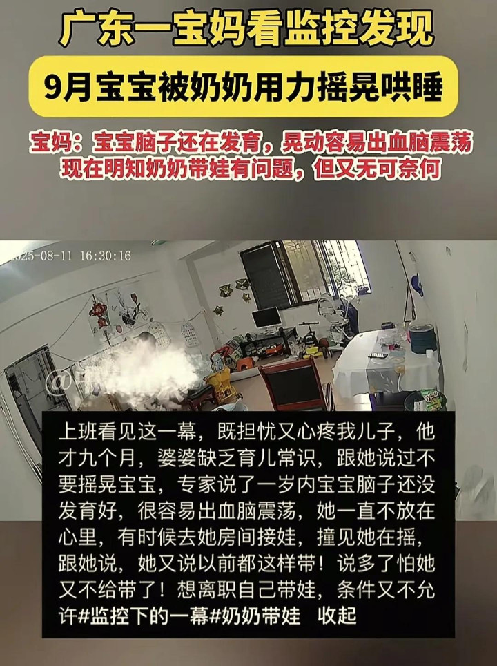 一个妈妈在上班的时候因为太想孩子了就悄悄打开监控来看孩子,万万没有想到眼前的一幕让她又怒又担心,原来她已经跟孩子的奶奶说过,孩子还小大脑发育还没有完全,千万不能抱着孩子用力地摇晃,但是在监控里面她却发现奶奶抱着孩子用力的摇晃,而且摇晃的幅度非常大。